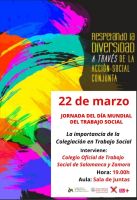 <p><strong>¡Día Mundial del Trabajo social – World Social Work Day!</strong></p><p>Esta fecha conmemora el compromiso, la contribución y la labor de nuestros/as profesionales como conocedores/as de primera mano de la realidad social, líderes del cambio y de la intervención social, e impulsores de la lucha y la garantía de los derechos sociales de la ciudadanía. Y más que nunca este día se debe dar a los/as profesionales del Trabajo Social el sentido de reconocimiento y orgullo que se merecen. Además se nos brinda esta oportunidad anual para que todas las organizaciones del Trabajo Social promovamos su importante papel y el de la profesión. Apostamos por incrementar nuestra presencia en el ámbito comunitario, buscando soluciones locales desde el enfoque del desarrollo social local. Pero también desarrollamos alianzas para buscar soluciones globales ante problemas globales.</p><p>En esta ocasión el lema escogido por la Federación Internacional de Trabajadoras Sociales es <a target=”_blank” href=”/archivos/docs/2023-WSWD-PO-Final-SpanishPaths.pdf”>"Respetando la diversidad a través de la acción social conjunta"</a>, continuando con la estrategia para lograr desde la profesión una transformación social inclusiva. La línea de acción parte de la <a href=“https://newecosocialworld.com/the-peoples-charter-for-an-eco-social-world/”>“Carta de los Pueblos para un Nuevo Mundo Ecosocial”</a>, un documento vivo, que crecerá a medida que las poblaciones del mundo compartan soluciones a los desafíos comunes y a la consecución de los ODS. Para que nadie se quede atrás y todas las personas puedan vivir con confianza, seguridad y paz en un mundo sostenible, ecológico y libre de desigualdades.</p><p>Como cada año el Colegio profesional de Trabajo Social de Salamanca-Zamora quiere conmemorar nuestra profesión y qué mejor manera que visibilizando nuestra entidad entre los y las futuros/as compañeros/as. Por ello, mañana estaremos en la <strong>Sala de Juntas de la Facultad de Ciencias Sociales en la Univerisdad de Salamanca con el alumnado de Trabajo Social a las 19:00h</strong>. ¿Te lo vas a perder?</p><p> </p>