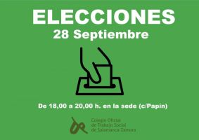<p>El próximo miércoles día 18 celebramos <strong>ELECCIONES </strong>a la Junta de Gobierno del Colegio y para participar puedes hacerlo de forma presencial o vía postal.</p><p>Si optas por votar de forma presencia en la sede del Colegio el horario será de 18,00 a 20,00 horas.</p><p>Si por el contrario optas por hacernos llegar tu voto a través de correo postal estas son las instrucciones que debes seguir:</p><ol><li>Introduce la <strong><a target=”_blank” href=”/archivos/docs/candidatura.pdf”>papeleta </a></strong>en un sobre cerrado y dirigido a la Presidenta de la Mesa Electoral.</li><li>Introduce el sobre anterior y una fotocopia de tu DNI en otro sobre también cerrado.</li><li>Señala claramente el remitente (persona colegiada).</li><li>Señala el destinatario: Presidenta de la Mesa Electoral, c/Papín 22, 37007, Salamanca.</li></ol><p><em>Desde el COTSSAZA animamos a toda la colegiatura a participar en este proceso de renovación de la Junta de Gobierno para continuar fortaleciendo y visibilizando nuestra profesión en los próximo años.</em></p>