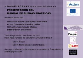 a Asociación ADAVAS Salamanca presentará el manual de buenas prácticas realizado desde el Proyecto Europeo B-SIDE: una barrera para detener el efecto domino, co-financiado por el Programa Daphne de la Comisión Europea, sobre los niños/as víctimas de violencia doméstica (CWDV Children Witness Domestic Violence )