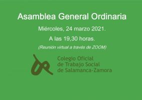 <p>Se convoca Asamblea General Ordinaria del Colegio Oficial de Trabajo Social de Salamanca-Zamora para el próximo miércoles, día <strong>24 de marzo de 2021</strong> a las 19:30 h. en primera convocatoria y a las 20:00 h. en segunda convocatoria mediante reunión virtual con arreglo al siguiente ORDEN DEL DÍA:</p><ol><li><em>Lectura y aprobación del Acta de la Asamblea anterior: 15 de diciembre de 2020. </em></li><li><em>Lectura y aprobación de la Memoria de Actividades y Económica del año 2020. </em></li><li><em>Ruegos y Preguntas.</em></li></ol><p>Se realizará virtualmente a través de la cuenta propia del COTSSAZA en la <a href=“https://zoom.us/j/94967136902”>Plataforma Zoom</a>.</p><p>ID de reunión: 949 6713 6902</p><p>Código de acceso: 439067</p><p>¡Os animamos a participar!</p><p>JUNTA DE GOBIERNO</p>