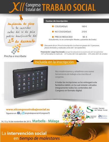 Si te interesa asistir al XII Congreso Estatal de Trabajo Social, que se celebra en Noviembre los días 14, 15 y 16. Tienes plazo hasta el 31 de julio y además aplican un descuento del 2%.