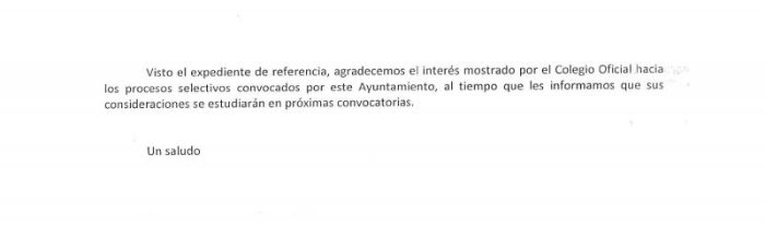 ACCIÓN. Escueta respuesta del Ayuntamiento de Salamanca al escrito del Colegio relativo a la convocatoria de 7 interinidades de TS.