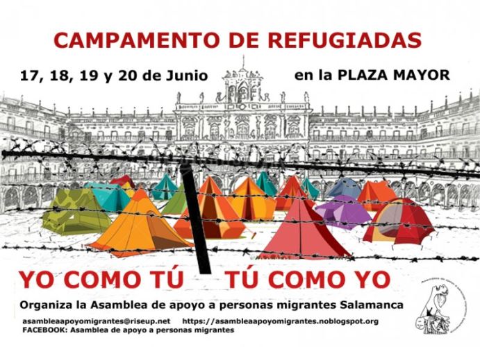 17,18, 19 y 20 de Junio, en la Plaza Mayor de Salamanca, la Asamblea de Apoyo a las personas migrantes de Salamanca, se recreará un campamento de personas refugiadas.