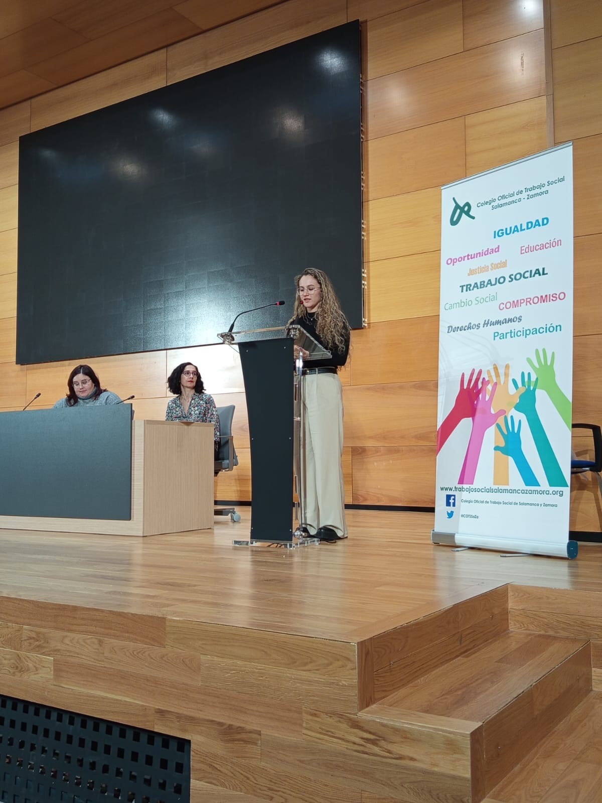 Así, profesionales, alumnado y docentes nos reunimos en la Universidad de Salamanca para crear un espacio de encuentro, diálogo e intercambio de experiencias, con la firme intención de reflexionar en torno a nuestra práctica profesional como acción necesaria para mejorar nuestra intervención. Un encuentro que permitió a futuros profesionales escuchar e interactuar con trabajadoras sociales con una notable y amplia trayectoria profesional. Estamos convencidas que han dejado huella en las futuras generaciones de trabajadores y trabajadoras sociales.