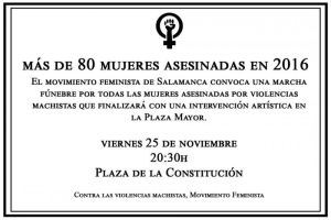 El Movimiento Feminista de Salamanca convoca una marcha fúnebre por todas las mujeres asesinadas por violencias machistas (más de 80 en lo que va de año). Saldremos de la Plaza de la Constitución a las 20:30h y acabaremos en la Plaza Mayor con una intervención artística.